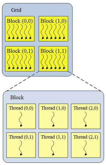 Because major transistors are devoted to data processing, GPUs are not good at controlling flow. Therefore, GPUs are generally used as a coprocessor with powerful computing capabilities in a computer system. In the context of CUDA, the tasks with a high computational amount are executed on GPUs in parallel (device), while the task of controlling algorithm flow is accomplished on the CPU (host). Due to thousands of stream processors on one GPU, GPU is capable of executing massively light-weight threads of the same program. A program executed in the GPU is called a kernel, which is executed in parallel using up to thousands of threads. In other words, multiple threads execute the same instructions, but operate on different elements of data. Considering the characteristics of GPUs, CUDA arrange threads in a form of a grid of blocks (see Figure 1).