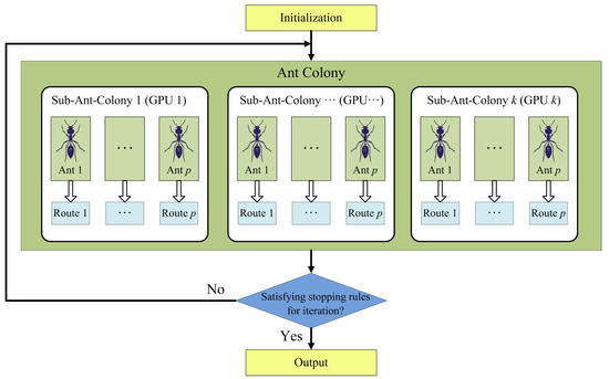 The multi-GPU system provides much more computing resource than the single-GPU system, and therefore, the computing task allocation of ACOEE must be redesigned. If the tasks with a high computational amount of each ant are allocated to different GPUs, just as in the parallel implementation of ACOEE in a single-GPU system, a number of synchronous operations will happen among GPUs and the host. In synchronous operations, data transmission via PCIe bus consumes much time. Furthermore, the computational amount allocated to each GPU is so small that GPUs cannot be fully utilized. For this reason, it is not a recommended choice. In this subsection, a parallel design based on multiple sub-ant-colonies is proposed (see Figure 2).