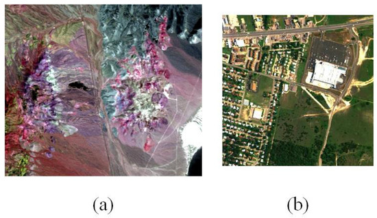 (a) False color composition of the Cuprite dataset. (b) True color composition of the Urban dataset.