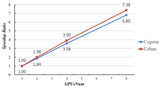 Figure 5 reveals the speed ratios of MG-ACOEE with different GPUsNum and G-ACOEE. When the GPUsNum increased, the speed ratio correspondingly increased. However, the speed ratios could not come up to GPUsNum, due to the time cost of data synchronization among different GPUs. It also can be found that the speed ratios in the experiments of Urban data were higher than the ones in the experiments of Cuprite data. That is because there were more bands in the Urban data, and more time was spent on searching for the optimal solution instead of data synchronization.