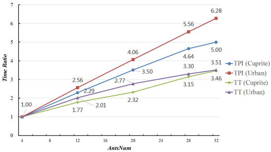 Table 12 and Table 13 report the average values and standard variances of RMSE, IN, TT, and TPI in these experiments. As AntsNum increased from 4–32, the RSME value decreased from 3.052–3.018 in the experiments on Cuprite data, which meant that the searching ability of MG-ACOEE distinctly enhanced. Since there were more ants in the colony, the computing amount searching for optimal solution accordingly increased. If the TT and TPI of MG-ACOEE with AntsNum = 4 was taken as a benchmark, Figure 6 reveals the time ratios of MG-ACOEE with different AntsNum and the benchmark. In this figure, it can be found that the TPI time ratios for Cuprite and Urban data, indicated by the TPI(Cuprite) and TPI(Urban) curves, were less than the AntsNum ratios in the MG-ACOEE with different AntsNum. For example, if AntsNum = 32, the AntsNum ratios was eight, while the TPI time ratios for Cuprite and Urban data were respectively 5.00 and 6.28. That was because the computing time searching for the optimal solution increased as AntsNum increased, while the synchronizing time cost essentially was unchanged. This also means that the percentage of synchronizing time in TT decreased accordingly. For the same reason, the TPI time ratios on Cuprite data were less than the ones on Urban data. As a result of enhanced searching ability in an iteration, less iterations were needed in MG-ACOEE with more ants in the colony to obtain the optimal solution. Therefore, TT time ratios were even less than TPI time ratios for both Cuprite and Urban data, shown by the TT(Cuprite) and TT(Urban) curves.