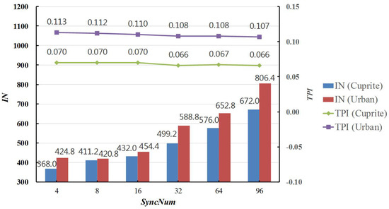 The variations of TPI and IN in Cuprite and Urban experimental results also can be found in Figure 7. It was revealed that TPI slightly decreased, whereas IN considerably increased, when SyncNum increased from 4–96. This was because the synchronizing number and correlative time cost was reduced accordingly. However, it should be particularly noted that there were fewer chances to check the convergence conditions of the algorithm as SyncNum went up. Therefore, the convergence conditions were more difficult to satisfy, and IN notably increased by more than 80%; as a result, more time was spent on obtaining the optimal solutions. Thanks to the more full searching in the solution space, the RMSE values were slightly reduced in both the Cuprite and Urban experimental results.