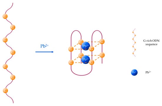 Another particular case is the formation of guanine (G)-quadruplexes induced by the presence of Pb2+ [56], as it is depicted in Figure 2. Although other metal ions, such as K+, Na+, or Ca2+ can slightly influence the conformation of the G-quadruplex structure [57], G-rich aptamers show good selectivity and specificity towards Pb2+ [58] owing to the high binding ability between Pb2+ and G bases [59].