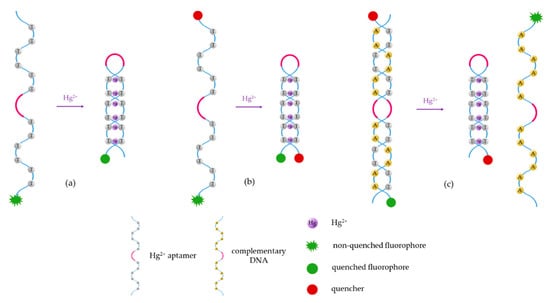 The third procedure (Figure 3c) consists of the detection of Hg2+ by competitive binding: a T-rich aptamer (labeled to the fluorophore or the quencher) is usually linked to its complementary DNA (labeled to the quencher or the fluorophore). In the presence of Hg2+, the complementary DNA separates from the aptamer, to which the Hg2+ ions bind, forming the T-Hg2+-T mismatches that give rise the hairpin structure [64].
