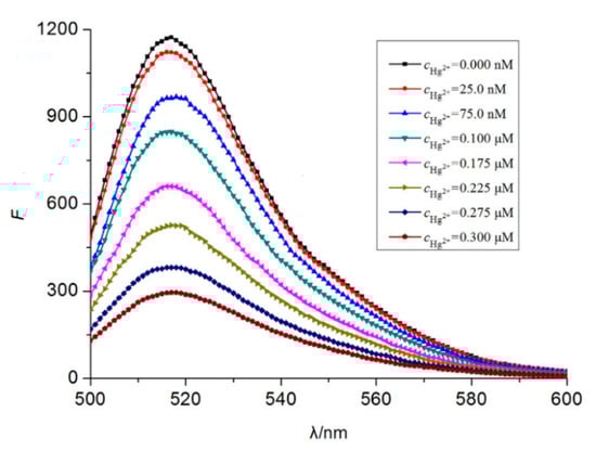 Fluorescence spectra of 5′-FAM-CGC TTG TTT GTT CGC ACC CGT TCT TTC TT-3′ for different Hg2+ concentrations. Reprinted with permission from [65].
