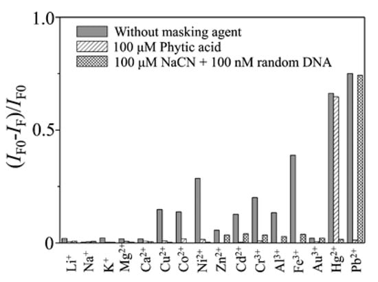 Quenching efficiency (IF0 − IF)/IF0 of the fluorescence intensity (518 nm) of the TBA-based sensor in the presence of metal ions in the absence and presence of masking agents. Concentrations: Hg2+, 1.0 μM; Pb2+, 100 nM; Li+ and Na+, 100 μM; K+, Mg2+, and Ca2+, 10 μM; other ions, 1.0 μM. Reprinted with permission from [61]. Copyright 2009 American Chemical Society.