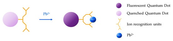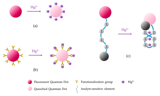 Sometimes, these QDs are functionalized with a sensitive element. That is the case of cysteamine-capped CdTe/ZnS core-shell QDs functionalized with T-rich aptamers [115] which, as explained previously, exhibit high affinity for Hg2+ ions. In the absence of Hg2+ ions, these aptamers act as an aggregator agent, resulting in a quenching of the fluorescence. As the Hg2+ concentration increases, T-rich aptamers acquire a hairpin structure and are detached from the QDs, which de-aggregate, giving rise to an increase of the fluorescent intensity. The LOD of this sensor was 8 × 10−11 M Hg2+, and it was capable of detecting Hg2+ linearly from 5 × 10−10 M to 1 × 10−6 M Hg2+. Taking advantage of the high affinity of thiourea for Hg2+, this compound was used to modify CdSe/CdS core-shell QDs for the development of a Hg2+ sensor [116] with a LOD of 2.79 × 10−9 M and a linear detection range from 5 × 10−9 M to 1.5 × 10−6 M. Although Cu2+ was found as an interferent ion, its presence could be masked with potassium cyanide. Apart from that, the recoveries of the fluorescent emission after removal of Hg2+ were between 83.8% and 95.4%.