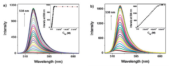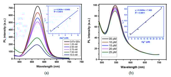 Among the semiconductor QDs, CdTe QDs have been widely employed for the monitoring of heavy metal ions [107,108]. Furthermore, their selectivity and sensitivity can be tuned by utilizing different capping agents [109], such as thioglycolic acid (TGA) or L-cysteine: in the first case, an electron transfer process occurs between the functional groups of TGA and Hg2+ ions, which quenches the luminescent intensity of the CdTe QDs. Thus, employing TGA capped CdTe QDs, it was possible to detect Hg2+ in the nanomolar range, from 1.25 × 10−9 M to 1 × 10−8 M, with a LOD of 3.5 × 10−10 M Hg2+, as it can be observed in Figure 8a. In the case of L-cysteine capped CdTe QDs, their interaction with Hg2+ ions depends on the concentration of the metal ion: for concentrations of Hg2+ in the picomolar range, these ions interact with the carboxylate moiety of the L-cysteine on the surface of CdTe QDs by electrostatic forces [110]. As a consequence, their luminescent intensity was linearly quenched by the Hg2+ ions from 5 × 10−12 M to 2.5 × 10−11 M, as it is displayed in Figure 8b. Furthermore, the LOD of this sensor was 2.7 × 10−12 M Hg2+. At higher concentrations of Hg2+, there is an electron transfer between the Hg2+ ions and the L-cysteine capped CdTe QDs [111] which induces not only a quenching of the luminescence, but also a red shift in the luminescence peak. Other QDs that show sensitivity to Hg2+ are hyperbranched-graft-copolymers-capped CdS QDs [112], L-cysteine-capped ZnS QDs [113] or polyethylene glycol-capped ZnO QDs [114].