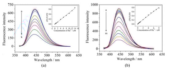 Fluorescence spectra of 10 μg/mL carbon QDs (a) and N-carbon QDs (b) upon addition of different concentrations of Hg2+ (a–k: 0, 0.6, 0.8, 1, 2, 4, 6, 8, 10, 12, and 14 μM; a–m: 0, 0.2, 0.4, 0.6, 0.8, 1, 2, 3, 4, 5, 6, 7, and 8 μM). The linear calibration ranges of each one of the sensors are shown in the insets. Reprinted with permission from [129].