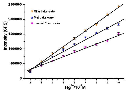 Li and co-workers [185] developed a turn-on fluorescent probe for Hg2+ based on a rhodamine B derivative (rhodamine B hydroxamate spirolactam) linked to a NS2 unit as a receptor that detected Hg2+ linearly from 0 to 1.6 × 10−5 M with a LOD of 2.36 × 10−6 M. The fluorescent response of the sensor towards Hg2+ was not interfered by any other metal ion and the probe was regenerated by using Na2S. Furthermore, the potential utilization of this sensor in real applications was tested by exposing the sensor to three natural water samples to which different Hg2+ concentrations were added, as shown in Figure 12.