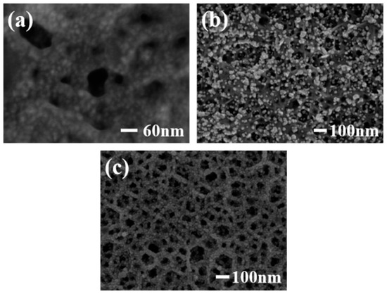 Figure 2a shows the SEM image of a Pt/PGaN electrode. The Pt nanoparticles were uniformly distributed throughout the pore structure of PGaN. Figure 2b shows the morphological features of Pd nanoparticles fabricated by CA method on a PGaN electrode. All of their forms were inhomogenous in density and size, with diameters from 10 nm to 80 nm. The Pd/PGaN electrode was only used for comparative studying. Figure 2c shows the SEM image of a Pd-Pt/GaN electrode. As can be seen, the Pd-Pt nanocomposites were well-distributed on the whole PGaN electrode surface. By selecting and optimizing the experimental conditions, nanocomposites can be prepared by a simple two-step electrodeposition process. In the first step, the preparation of the Pt catalyst supported on a PGaN electrode by CV was conducted in a chloroplatinic acid electrolyte. In the case of high deposition overpotential, the deposition process of metal particles follows the instantaneous nucleation mechanism [19]. The negative potential of CV was therefore set to −1.5 V, which was beneficial to the growth of small-sized Pt particles. In the second step, Pd nanoparticles were not only deposited on the pore walls of the PGaN, but also in combination with metal Pt to form the nanocomposites. A constant potential electrodeposition was carried out at −1.5 V, and a uniform, compacted and good adhesive active layer was obtained. During the whole process, the pore structure of PGaN can effectively restrain the agglomeration of nanoparticles.