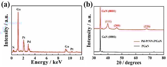 (a) EDS spectrum of the Pd-Pt/PGaN electrode. (b) XRD patterns of the PGaN and Pd-Pt/PGaN electrodes.