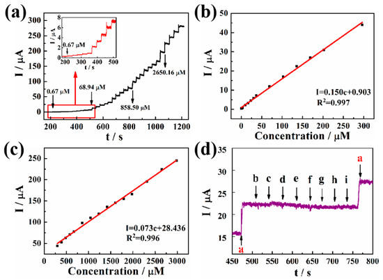 Figure 5a shows the peak current responses of a Pd-Pt/PGaN electrode to NaNO2 in a 0.1 M PBS buffer at an applied potential of 0.65 V under stirring. The Pd-Pt/PGaN electrode exhibited a timely increase response towards every addition of NaNO2, and the amperometric response attained a steady state in less than 3 s. Furthermore, the corresponding calibration plots of the response to the nitrite concentration are shown in Figure 5b,c. The current increases linearly with the concentration of NaNO2 in two ranges. One is from 1 to 300 µM with a linear regression equation of I (µA) = 0.903 + 0.150c (µM) and the correlation coefficient of 0.997. The sensitivity of the electrode is as high as 150 µA/mM. The other linear regression equation is the concentration range of I (µA) = 28.436 + 0.073c (µM) from 300 to 3000 µM. The sensitivity and correlation coefficients are 73 µA/mM and 0.996, respectively. The limit of detection (LOD) of this sensor is 0.95 µM with a signal-to-noise ratio of 3. The obtained results show that the Pd-Pt/PGaN electrode possesses excellent electrocatalytic activity towards the oxidation of nitrite.