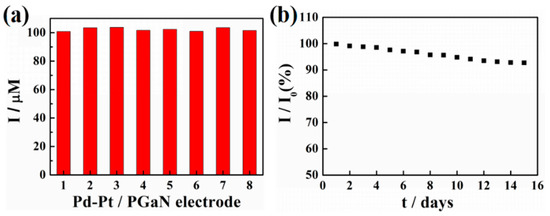 The reproducibility and stability of a Pd-Pt/PGaN electrode were tested in 0.1 M PBS containing 1 mM NaNO2, as shown in Figure 6a,b. The reproducibility was investigated by comparing the amperometric responses produced by different electrodes under the same condition of preparation. The peak current values of eight Pd-Pt/PGaN electrodes were 100.8, 103.4, 103.7, 101.6, 102.3, 100.9, 103.5 and 101.5 µA, with an RSD of 2.37%, as shown in Figure 6a. Moreover, the Pd-Pt/PGaN sensor was stored under atmosphere condition for 15 days to evaluate its stability, as shown in Figure 6b. The electrode retained 93% of the initial current response after 15 days. The above sensing performances confirm that the Pd-Pt/PGaN sensor exhibits both high reproducibility and stability in the nitrite detection process.