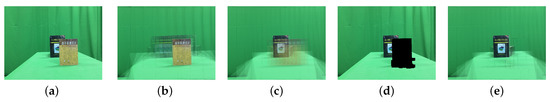 The first scene included two books located in a line facing the camera array. We made use of the camera array (Figure 3a) to capture this scene, and the input image sequence consisted of eight images of 640 × 480 pixels. Examples of the input images are shown in Figure 6.