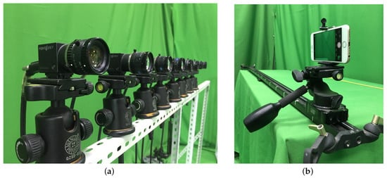 In this section, with both indoor and outdoor scenes involved in our experimental evaluations, two types of camera arrays were used to demonstrate the effectiveness of our proposed method. The first camera array (Figure 3a) consisted of eight Point Grey Research Flea2 color cameras, each of which has a resolution of 640 × 480, and their focal lengths were 751.2 measured in pixel units. The distance between two cameras was approximately 13 cm. The second camera array used in our experiments was virtual and used a horizontal slider rail with iPhone 6. The distance between the two viewpoints was roughly 10 cm, while the distance between the starting and the ending points was approximately 80 cm. It can cope with complex experimental conditions well (Figure 3b).