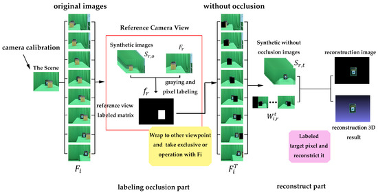 With the help of SAI, the occluded object can be reconstructed with the following steps. To begin with, the camera needs to be calibrated to obtain its internal parameters. Meanwhile, the relative-position relationship between cameras is calculated by using the principle of triangulation, which provides the basic condition for SAI. Then, the SAI method which plays a key role in the entire algorithm is presented, running through the subsequent steps. Next, occluded pixels are labeled based on SAI, and image matting is introduced, which corresponds to the labeling-occlusion part shown in Figure 4. Finally, the reconstruction method without occlusion is presented, which corresponds to the reconstructed part shown in Figure 4.