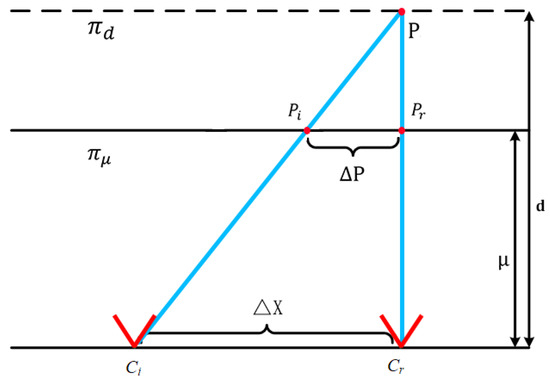 Then, the camera array is calibrated with the method [7]. After fixing the camera array, the calibration board is used to take multiple sets of data for calibrating the camera array. In particular, the calibration board remains parallel to the camera array plane during capturing. Next, one set of data is selected as the reference plane , and the distance between this set of data and the camera array is called the reference distance . Then, one of the cameras in the camera array is selected as the reference camera . The homography matrix from different cameras to the reference camera is calculated according to the corner points, and will be applied to the following steps. As can be seen from Figure 5, a point P beyond the reference plane has distinct images , in cameras , . The parallax between these two images depends on the relative camera displacement and relative depth , which can be formulated as: