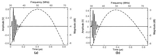 The simulated pulse-echo response (solid line) and their frequency spectra (dashed line) for 50 MHz PVDF of (a) single-focal point transducer and (b) the second part of multifocal point transducer. The simulated pulse-echo response and frequency spectra of the first part were similar to the signals of single-focal point transducer, whereas the other parts were similar to the second part.
