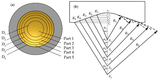 To obtain focused images at varying depths, the main challenges are to develop the MFP transducer using five focal points. These focal points were distributed in the axial direction with an interval of 1 mm (b = 1 mm). The front face of the MFP transducer was divided into five parts with an equal area. Each part comprised a spherical surface with a radius and a height , respectively. Figure 2 shows the structure of the multi-spherical profile.