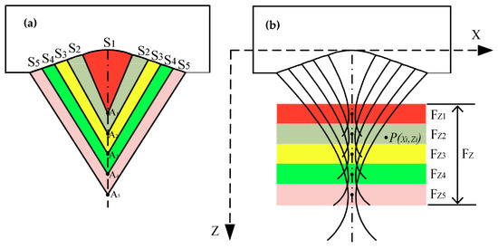 The length of the focal zone of MFP transducer can be extended by connecting several focal zones. These focal zones were generated using several different spheres and their center points (Ai, I = 1 to 5) are located on a straight line. Each spherical shape contributes to one focal point as shown in Figure 3 a. The transducer can be moved along with the X-axis to acquire the data. When a point P (xi, zi) is positioned in the acoustic field of the sphere “Si” (“Si” is called part “i”, i = 1 to 5), the detected signal should contribute to the focal point Ai. The focal length of part “i” is “Ri “. Each part of the multifocal sphere can detect the signal in each focal zone, which is described in Figure 3b. For example, the part “i” can detect the signal in the focal zone “Fzi”. The object located around the point Ai in the focal zone “Fzi” will acquire the best image. The target located outside of the focal zone will obtain the blurry image.