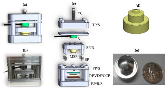 (a) Design of the press-fit system for creating the front face of the multi-focal point (MFP) transducer. (b) Photograph of the press-fit system. (c) Components of the press-fit system: Base plate/rod/screw (BP/R/S), Teflon/PVDF film/copper-clad polyimide (T/PVDF/CCP), pressure plate/screw (PP/S), spring (SP), multi-spherical pattern (MSP), slide plate/rod (SP/R), sensor of force (S), top plate/screw (TP/S), force screw (FS). (d) Design of multi-spherical pattern for creating transducer using five focal points. (e) Photograph of multi-spherical pattern.