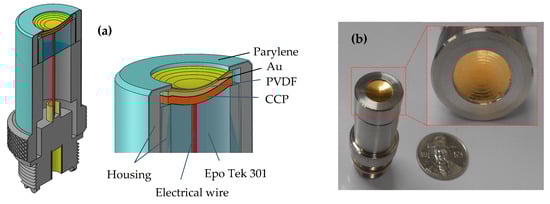 The second stage involved the fabrication of the acoustic stack with transducer housing. The PVDF and CCP were trimmed as close as possible to the epoxy plug. A small line of CCP was kept and soldered using an electrical wire, which was then connected to the center pin of the UHF connector. The acoustic stack was placed concentrically with transducer housing. A piece of PVDF was connected to housing using silver epoxy (H20 epoxy, Epoxy Technology, Inc., USA) to form a ground path. To maintain the long-term electrical and mechanical stability of the transducer, a nonconductive epoxy was filled into the open space inside housing. Following the curing of the epoxy, a negative electrode of the active elements was connected to the UHF connector through the housing transducer. An electrical impedance matching was placed inside the housing, followed by a nonconductive epoxy filling. A quarter-wavelength thickness of parylene was sputtered on the front face of the transducer to protect the surface and function of the matching layer, which ensured the transfer of acoustic energy between the piezoelectric and the load medium. Figure 5a shows the cross-sectional view of the MFP transducer with the components used for fabrication. The digital photograph of the completed MFP transducer is shown in Figure 5b.
