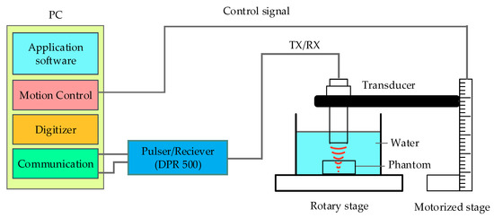 Figure 6 shows the schematic representation of the experimental procedure. The transducer was connected to a computer-controlled remote (DPR 500, JSR Ultrasonics, Pittsford, NY, USA) pulser/receiver and excited using an electrical impulse of 200 Hz repetition rate at Ω damping and energy per pulse. To measure the pulse-echo and frequency spectra of transducers, a glass plate was placed at the focal point as a target. The reflected waveform was received using a 500 MHz bandwidth receiver with a high pass filter of 5 MHz and a low pass filter of 500 MHz. The obtained raw data was further digitized at a high-speed sampling frequency of 500 Megasample/s. The echoes were digitized by an 8-bit digitizer (NI PCI-5153EX, National Instruments, Austin, TX, USA).