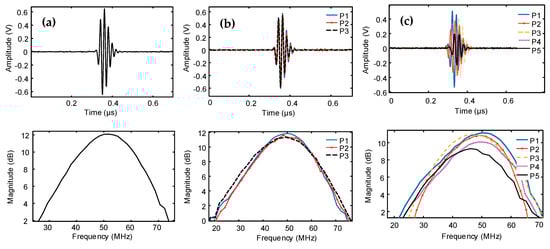 Pulse-echo experiments were employed in a water tank using a glass plate placed at the acoustic focus. The pulse-echo response and the frequency spectrum of transducers are shown in Figure 8.