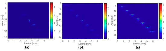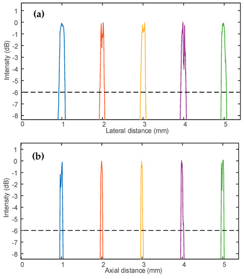 Seven phantom wires (25 µm) were positioned diagonally with an equal distance of 1 mm in the axial direction and 1 mm in the lateral direction (Figure 7a). The wire was placed at the focal point of the transducer in degassed water and scanned in a lateral direction. The echo signal that reflected from the wire was used to build the beam profile to establish the size of the beam in the lateral direction. Data were imported to MATLAB software (Version. 2013a, Mathworks, Natick, MA, USA) for image processing.