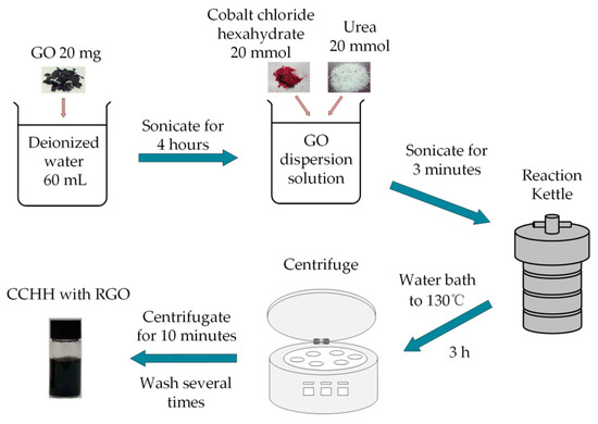 GO (20 mg, #XF002-1, XF Nano Inc., Nanjing, China) was dispersed in deionized water (60 mL), vibrated and sonicated for 4 h. After GO dispersed evenly in the solution, cobalt chloride hexahydrate (20 mmol, #20160823, Guangdong Guanghua Sic-Tech Co., Ltd., Shantou, China) and urea (20 mmol, Tianli Chemical Reagent Co. Ltd., Tianjin, China) were added into the dispersed solution, stirred and sonicated for 3 min. When the two chemicals were completely dissolved and evenly distributed in the solution, the solution was transferred into a reaction kettle to conduct hydrothermal reactions for 3 h under 130 °C. The solution fabricated by hydrothermal reaction was centrifuged and washed with deionized water several times. The obtained material was dried in oven under 60 °C for 12 h and the final product was obtained. The fabrication process of CCHH with RGO hybrid structure was shown in Figure 1. For comparative experiments, GO was processed in the same experimental procedure without cobalt chloride hexahydrate and urea. The results of the two experiments were attentively compared.