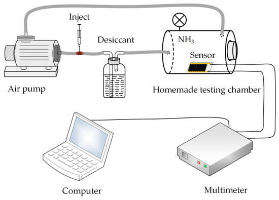 The whole ammonia gas sensing system was based on the homemade testing chamber shown in Figure 2 and the total volume of the system was calculated as 4.67 L. Desiccant in the flask was sodium hydroxide used to convert ammonia solution into dry ammonia gas, which was passed into the testing chamber by an air pump (MEDOVP0125-V1005-P2-1411, Nitto Kohki, Tokyo, Japan). The calculation details of dry ammonia gas concentration were included in the Supplementary Materials (SM). The test results were recorded by the multimeter (2000, Keithley Instruments, Cleveland, OH, USA). The entire test experiment was carried out at the temperature of 25 ± 2 °C and the humidity of 30 ± 5%.