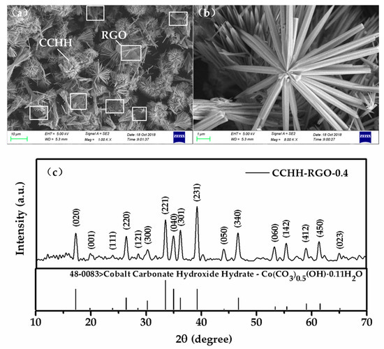 Figure 3. (a) Scanning electron microscope (SEM) image of CCHH-RGO-0.4; (b) the enlarged SEM image of CCHH-RGO-0.4; (c) X-ray diffraction (XRD) pattern of CCHH-RGO-0.4.