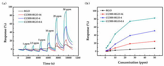 Figure 5 illustrated the gas sensing responses of four sensors at different ammonia concentrations. The gas sensing responses of these sensors gradually increased with the ammonia concentration and tended to be saturated and did not continue to increase when the ammonia concentration reached a higher value. As it could be seen clearly from the response curves, the response of RGO exhibited the lowest value, CCHH-RGO-4 exhibited higher value than CCHH-RGO-16, while CCHH-RGO-0.4 showed the highest response compared to the other three sensors. From the test results, the gas sensing response of the sensor to ammonia gas increased with the decrease of RGO mass proportion in the hybrid structure. When the RGO mass proportion reached 0.4%, the gas sensing response was highest. As the RGO proportion continued to decrease, it would be very difficult to conduct gas test due to the great resistivity of the sensor such as CCHH and CCHH-RGO-0.1.