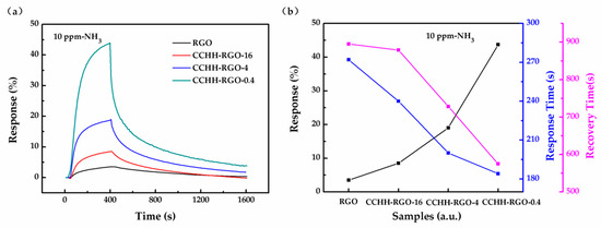 To study the gas sensing mechanism of the hybrid structure sensor, we performed a gas sensing test on the 10 ppm ammonia gas for four sensors with a gas on (360 s)/gas off (1200 s) cycle of 1560 s at the same time. Figure 6a showed the gas sensing curves of four sensors to 10 ppm ammonia. The gas sensing response, response time and recovery time of each sensor were shown in Figure 6b. RGO showed the lowest response (3.5%), the longest response time (272 s) and the longest recovery time (895 s). The gas sensing response increased, the response time and the recovery time decreased with the decrease of RGO mass proportion in the hybrid structure. When the RGO mass proportion reaches 0.4%, CCHH-RGO-0.4 showed the highest response (43.7%), the least response time (184 s) and the least recovery time (575 s) toward 10 ppm ammonia.