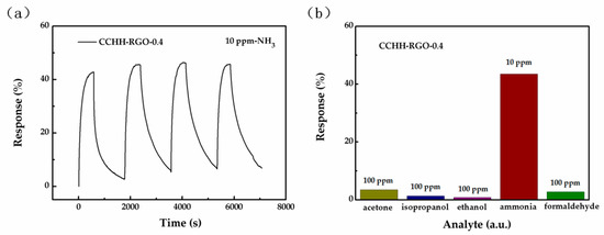 The exposure of the CCHH-RGO-0.4 to four continuous cycles of 10 ppm ammonia was shown in Figure 7a. The sensor showed approximately the same response value and the response/recovery time, revealing its excellent repeatability under room temperature. In order to test the selectivity of the sensor to ammonia gas (10 ppm), four other kinds of 100 ppm gases were tested under exactly the same test conditions, including acetone, isopropanol, ethanol and formaldehyde shown in Figure 7b. The device responded slightly to acetone and formaldehyde but hardly to isopropanol and ethanol. However, in sharp contrast, the device showed a very high response to ammonia, suggesting the strong selectivity of CCHH-RGO-0.4 towards ammonia.