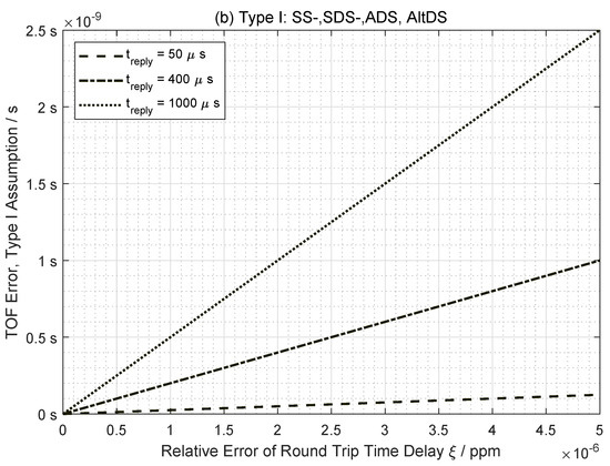 As a consequence, the existing TOF error-estimation model for TWR, described in the IEEE 802.15.4-2011 standard, tackles clock drifts as the only dominant errors [3] (pp. 258–275). However, this model is inadequate for analysis of system performance between different TWR methods, especially when it is important to identify a better method for a certain application. For instance, the performance difference between two closely related TWRs, such as a symmetric double-sided TWR (SDS-TWR) and alternative double-sided TWR (AltDS-TWR), cannot be definitely clarified using the existing model [4]. Moreover, AltDS-TWR is robust against the variation of reply time, as we discuss in Section 7.3.1, which cannot be explained with a conventional clock-drift model, as above.