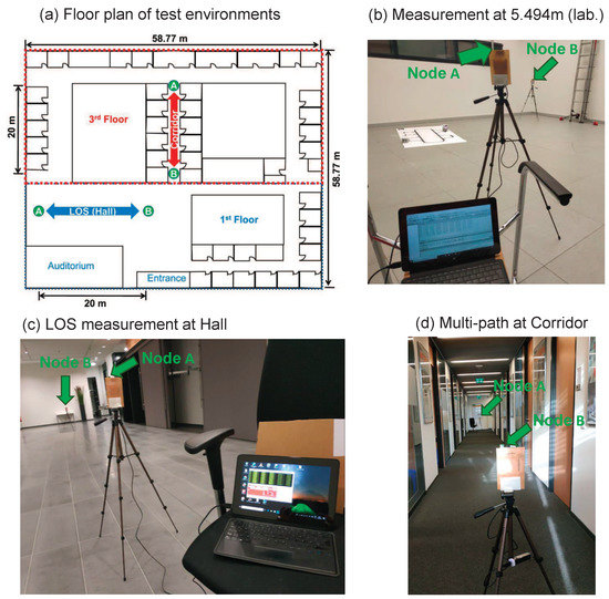 It should also be noted that the relative error presented in the simulation results (Section 6) includes all delays (PTD, PATD, TTD, and RTD) mentioned in Section 3.1. However, the relative errors regarding TTD and RTD were excluded in the experiment results (Section 7). In practice, a certain approximately constant delay error (with regard to a complete hardware setup) can be identified by evaluating two transceivers under the known ground-truth reference distance in a pure LOS scenario. The procedure of eliminating this constant, which is subtracting the mentioned constant from the measured (estimated) TOF value to match with the ground-truth reference distance, is typically called an aggregated antenna delay calibration in the world of UWB hardware implementation [29]. This corresponds with the elimination of TTD and RTD delays in our case, which was calibrated before measurement was started, as stated in Section 7.1.