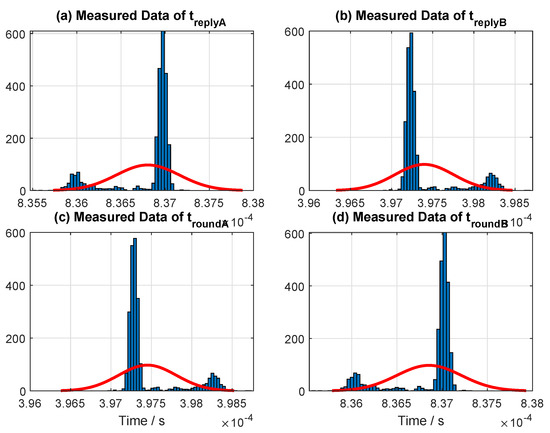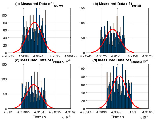 A total of ten trials for variable reply times with the magnitude of difference between the two reply times (and) starting from 0.0003 (symmetry case) up to are provided in (Table 7). The first four trials from Table 7 are illustrated in Figure 13 to visualize the data for better analysis. Note that only one of the two reply times, specifically, , is varied in the experiment by manipulating the value of delays on the ranging software (see Columns 6 and 7 from Table 7, denoted as “Reply Time ()”).