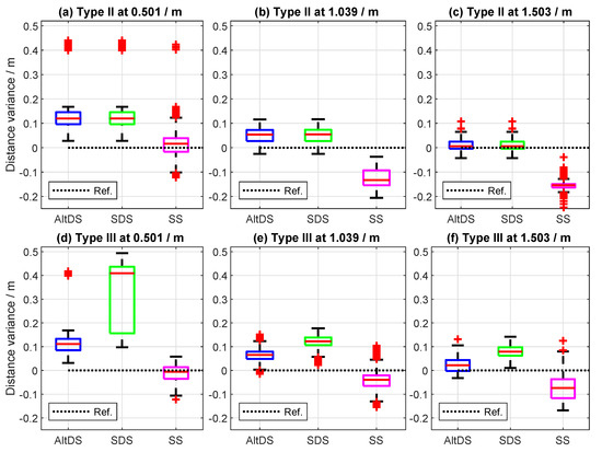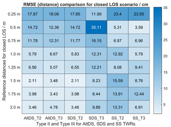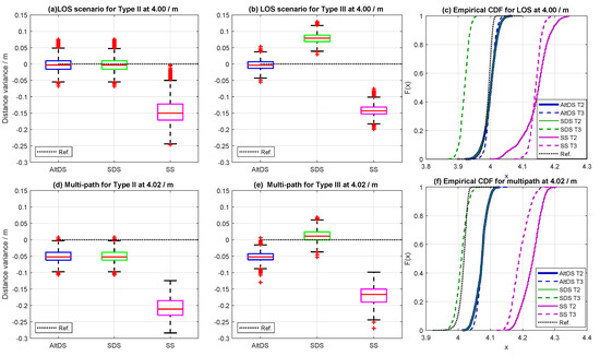 In general, a significantly high rate of outliers (symbolized with red plus signs) is presented in the data of measurement results less than (see the sample data measured at (Figure 11a,d). It can also be seen that the measured SDS data relatively skew at a reference (Figure 11d). The contribution of outliers in the data decreases as the true-reference distances between the two transceivers increase. Specifically, the RMSE for all TWRs in both cases was roughly greater than 11 cm at reference distances less than (first three rows in Figure 12). Moreover, it can be stated (for this particular UWB setup) that the effect of the PATD on the LOS condition decreases, starting from of the true reference (last three rows in Figure 12). In this case, the measured RMSE for AltDS (both Type II and Type III) and SDS (Type II) is always less than 5 cm. The transition phase (RMSE between 5 and 10 cm) can be spotted in the measured results at the true reference of somewhere between 0.75 and .