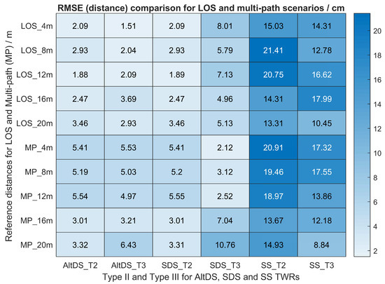 The symmetry case is again evaluated in this scenario as provided in Trial 1 to demonstrate comparative analysis between the special case (Type II) and typical case (Type III). In the symmetry case, both AltDS and SDS had identical performance level and the RMSE in distance estimation was also the same in this particular experiment, with an exact value of cm (Figure 13 and the first-row in Table 7). A similar result was already reported in Section 7.2. However, distance error using SS-TWR is significantly higher than both of AltDS and SDS.