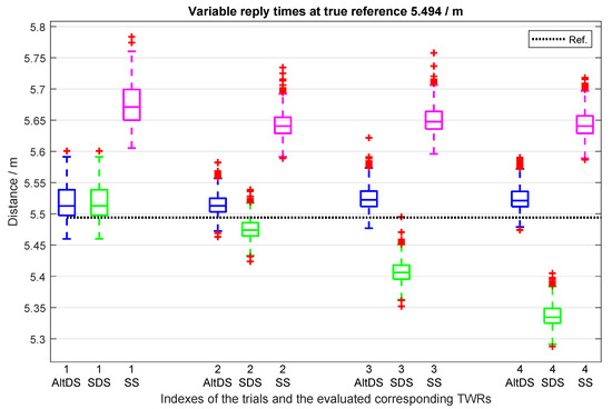 Figure 13 also clearly demonstrates the pitfall of SDS-TWR, frequently mentioned throughout this article. As the name symmetric is applied in the method itself, a very small error occurs in SDS when the two reply times are exactly the same (Trial 1 in Figure 13). Moreover, we witnessed that SDS is comparable to AltDS in the symmetry case. Note that it rarely happens to have a symmetric reply time in a real-world situation. In this experiment, the two reply times ( and ) were tuned to the software until they approximately had the same value (see the tuned value of their magnitude of difference ()) in Table 7 (second column), which had in symmetry case (first row). When symmetry in the reply time is broken down, SDS encounters significant distance error. The severity in error monotonously increases as the difference between the reply times () increases (Figure 13 and Table 7). Distance error even reaches cm when the the magnitude of difference between the two reply times () is (last row in Table 7).