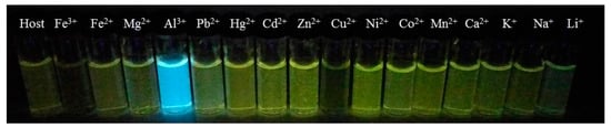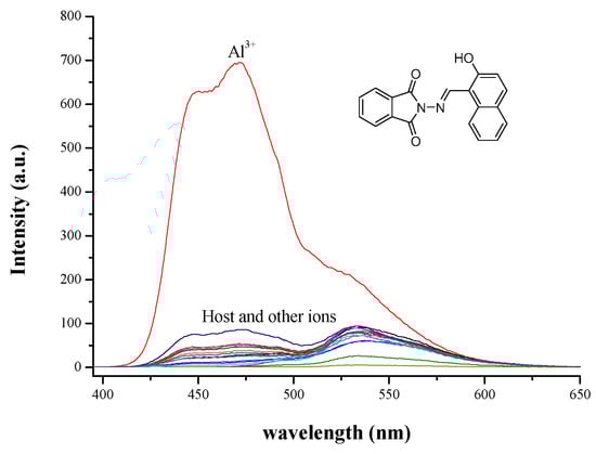 Al in its ionic form, Al3+, is found in most animal and plant tissues and in natural water. Detecting and quantifying Al3+ is crucial for controlling its concentration in the biosphere and its direct impact on human health. Various kinds of sensors have been reported for selective Al3+ detection [9,10,11,12,13,14,15,16,17,18,19,20,21,22,23,24,25,26]. However, these sensors are limited by their complicated synthesis, low water solubility, and lack of sensitivity. For practical applications, a water-soluble sensor for detecting Al3+ is still in great demand. Recently, several fluorescent probes have been synthesized for sensing Al3+ in cells [27,28,29,30]. The use of fluorescent probes for biosensing and bioimaging the ion in animal cells has also been reported. However, these fluorescent probes have not yet been examined for their application in plant systems. The detection of metal ion by fluorescent probes in plant tissues has always been problematic because of interference from the intrinsic fluorescence of the cell wall and secondary metabolites such as tannins, alkaloids, and polyphenols [31,32].