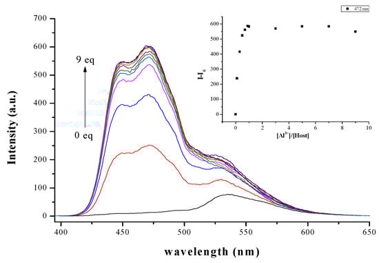 To further investigate the chemosensing properties of probe L, probe L was fluorescence-titrated with Al3+. The changes in fluorescence spectra for probe L as a function of Al3+ content are shown in Figure 4. With increasing amounts of Al3+ added to a solution of probe L in DMSO-H2O (1:9 v/v), the emission band at 530 nm gradually increased, and concomitantly a new emission band appeared that peaked at 472 nm. A Job plot indicated a 1:1 stoichiometric complexation of probe L with Al3+ (Figure S5). Additionally, the formation of a 1:1 complex between probe L and Al3+ was confirmed by the appearance of a peak at m/z 393, assignable to [probe L + Al3+ + 3H2O − 4H+] in the ESI/MS (Figure S6). From the fluorescent titration profiles, the association constant for probe L-Al3+ in DMSO-H2O (1:9 v/v) was determined as 3 × 107 M−1 by a Hill plot (Figure S7). By using the abovementioned fluorescence titration results, the detection limit for Al3+ was estimated as 1 ppb.