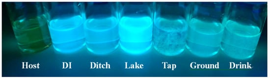 Color changes by UV light for probe L (40 μM) in different sources of water (DMSO : H2O = 1 : 9 v/v) containing 5 equiv. of Al3+.
