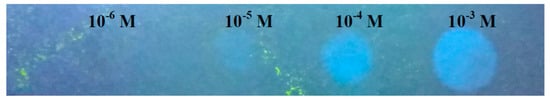 Testing paper detection is an inexpensive approach to detect the presence of an analyte. Toward this goal, we first coated filter paper with probe L by soaking in a DMSO-H2O (1:9 v/v) solution followed by air drying. Al3+ at different concentrations was added to this probe L-coated test paper: the color of the paper changed from dark green to light blue instantly (Figure 6), caused by the interaction of probe L and Al3+, therefore implying that the test paper specifically recognized Al3+. The detection limit of Al3+ with this probe L-coated test paper was 1.0 × 10−5 M.