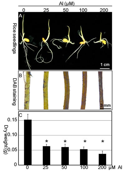 Rice plants (Oryza sativa L. cv. TN67) were grown as described in [33] with minor modification. The seeds were incubated at 37 °C for 3 d in darkness. Ten germinated seeds with coleoptiles reaching 2 mm in length were transferred to a Petri dish (9 cm in diameter) with a filter paper. The rice seedlings were incubated with deionized water supplemented with Al(ClO4)3 (Sigma-Aldrich, St. Louis, MO, USA) from 25 to 200 μM, treated with Al3+ solution (10 mL in each Petri dish) for 10 d, then subcultured with fresh solution for another 10 d. Control seedlings were incubated without Al3+. The rice seedlings were analyzed for root elongation and reactive oxygen species (ROS) production. For measuring dry weight and accumulation of Al3+, samples were dried by incubation at 37 °C for 7 d. Data were obtained from at least three biological replicates.