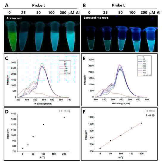 Quantitative determination of Al concentrations in rice seedlings. (A) Fluorescence probe L with the addition of various concentrations of Al(ClO4)3 solution (0, 25, 50, 100, and 200 μM) was excited by a handheld UV lamp with 345 nm excitation. The blue emission was photographed immediately in the dark. (B) Fluorescence probe L with the addition of rice extracts on treatment with various concentrations of Al3+. The samples were excited by UV, and blue emission was photographed. (C) Measurement of fluorescence intensity of probe L at 495 nm with the addition of rice extracts on treatment with various concentrations of Al3+. All data were measured after 20 min nm. (D) Fluorescence values corresponding to each treatment in (C) were plotted. (E) Measurement of fluorescence intensity of probe L with increasing concentrations of Al3+ standards (0, 50, 100, 150, 200, and 300 μM) dissolved in control seedling extracts. (F) A linear calibration curve was constructed on the basis of fluorescence intensity and Al3+ standards. Three replicates were performed with nearly identical results.