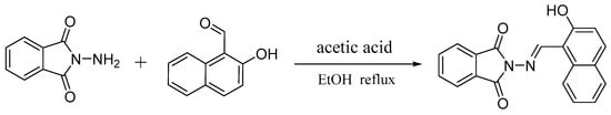 The synthesis of probe L was based on the following method (Scheme 1). 2-hydroxy-1-naphthaldehyde (0.278 g, 1.61 mmol) was added to a solution of 2-aminoisoindoline-1,3-dione (0.303 g, 1.87 mmol) in dry ethanol (15 mL) with two drops of acetic acid. The reaction mixture was refluxed overnight and then the solvent was removed under reduced pressure. The resulting solid was washed with cooled EtOH repeatedly to give probe L (0.469 g, 80%) as a yellow solid; melting point: 234.0 °C; 1H NMR (300 MHz, DMSO-d6) 11.95 (s, 1H), 10.07 (s, 1H), 8.62 (d, 1H, J = 4.4 Hz), 8.05 (d, 1H, J = 4.4 Hz), 7.99–7.90 (m, 5H), 7.66–7.61 (m, 1H), 7.47–7.42 (m, 1H), 7.28 (d, 1H, J = 4.5 Hz); 13C NMR (75 MHz, DMSO-d6) 164.33, 159.50, 159.26, 134.99, 131.77, 130.16, 129.04, 128.44, 127.99,123.94, 123.54, 122.28, 118.67, 108.61; HRMS(EI): calculated for C19H12N2O3(M + H), m/z 316.0848; resulting m/z 316.0839. (Figures S1–S3).