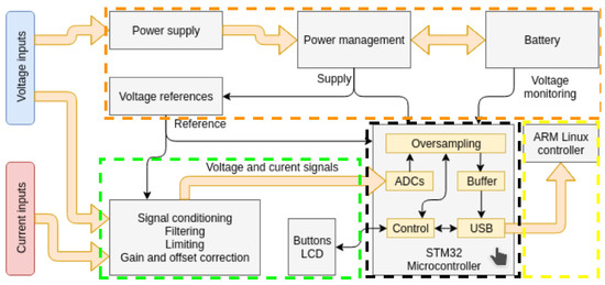 openZmeter (oZm) hardware block diagram. Block for signal acquisition coloured in green, power supply and management elements coloured in orange, STM32 microcontroller in black, and advanced RISC machine (ARM) Linux board controller in yellow.